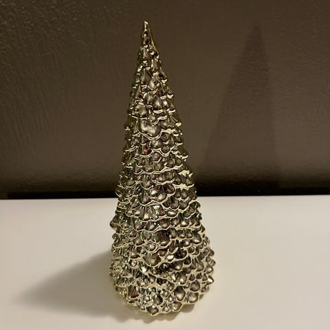 To juletrær i sølv og glitter. Dekorative trær i ulike størrelser som pynter opp en gang eller stue. 🎄