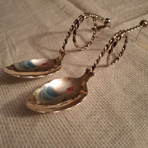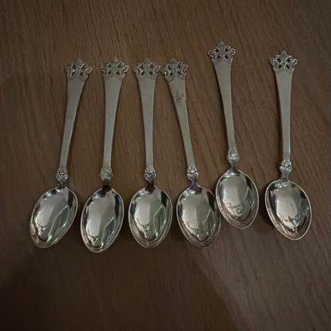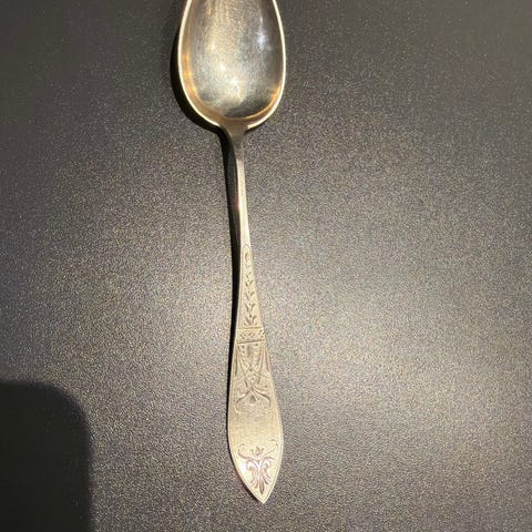 Sølvskje med dekorert skaft. Skjeen har et mønster på håndtaket og er laget av sølv. Egnet til servering eller som samlerobjekt.