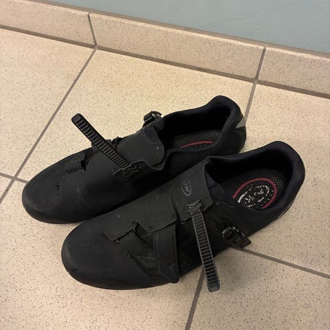 Legg merke til at gummi-stølte under skoene på ene siden har falt av. Ingen praktisk betydning for syklingen.