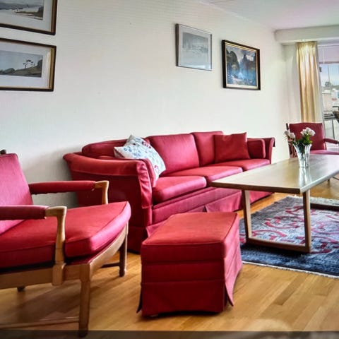 Selger en brukt 3-seter sofa fra Hødnebø. Sofaen er godt brukt, med flekker på putetrekk og der midtre sofapute har revnet på begge. Putene fremstår ellers intakte og ikke vesentlig nedsunket eller deformert av tidligere bruk. Ellers er treverket av flammebjerk flott og intakt uten synlige merker. Sofaen vil kunne blir så god som ny med en omtrekking av putene.