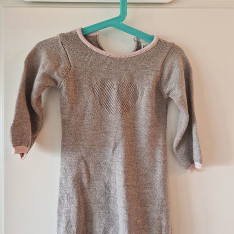 Veldig fin hvit/offwhite ullkjole fra Lillelam. Pent brukt, men er bittelitt gul i halsen (se bilde) og en veldig svak flekk (se siste bilde). Synes så vidt.