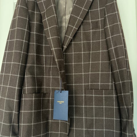 Selger to helt nye og ubrukte blazere fra sydd i eksklusivt Loro Piana merinoullstoff (Made in Italy). Klassisk rutevev i beige/taupe med diskrete blå linjer og en i mørke brun ruter – et tidløst og svært elegant plagg som passer både til jobb, fest og pent fritidstøy.