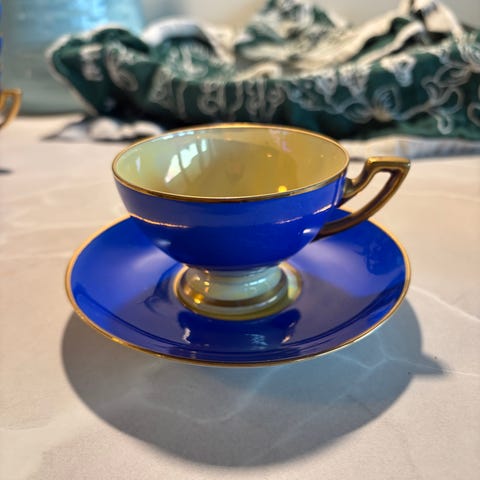 Thomas Bavaria, Thomas Bayern, Rosenthal, 1930, 30-tall, Art Deco, håndmalt, hand painted, kuvertskål, kuvertskåler, skål, skåler, saucer, blått, blå, småprikkete, prikker, porselen, porcelain, Tyskland, Germany, Bavaria, vintage, retro, antikk, samler, collectible, servering, soyasaus, dip, borddekking, elegant, klassisk, skandinavisk, nordisk, 6 stk, sett, dish, dishes
