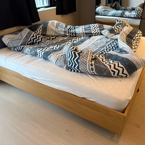 Daybeden er konstruert helt uten skruer, hvor all sammenføyning er gjort med dybler i bjørk, noe som gir både styrke og et flott uttrykk. Overflaten er behandlet med lut og hvit olje (Rubio Monocoat), som fremhever treets struktur og gir en lys, naturlig finish. Alle kvister er behandlet med epoxy før sliping for å forhindre gjennomslag av kvae. Understellet er kvistfritt. Ingen synlige kvister når madrass ligger oppå.
