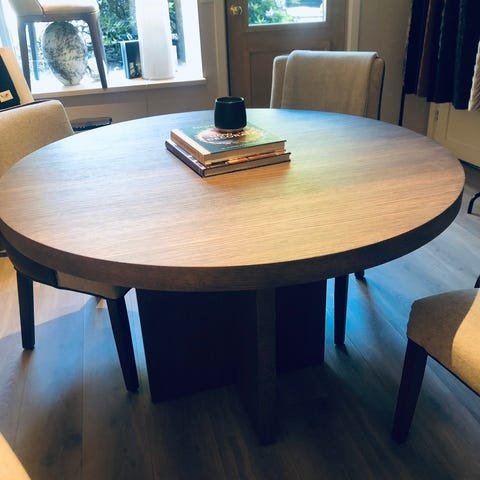 A line spisebord plank i hvitoljet eik fra Skeidar selges. Bordet er som nytt. Ingen merker. Bordet fremstår som eksklusivt og solid. To innleggsplater a 50 cm som settes i på hver ende. Vi har dekket til 12 rundt bordet.