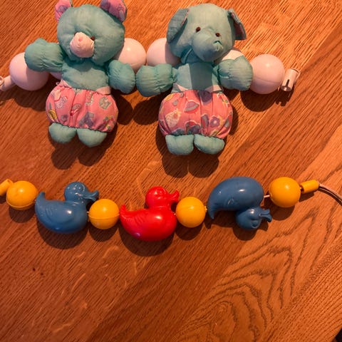 Utrolig sjarmerende vognrangle med hunder og baller fra 70-tallet. Bruksmerker. Alle hundene og ballene er hele. Strikken er i orden. ca. 35 cm er bredda når hundene og ballene står side om side. Kan dras ut til ca. 65 cm. Lyd når du rigler på den.