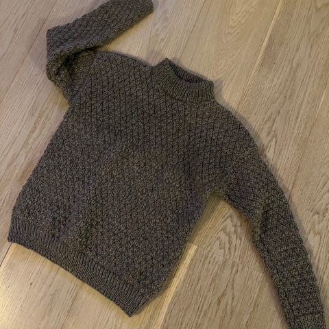 Kjøpt på marked. Brukt to ganger og er blitt for liten. Strikket i merinoull og er ca 134 i strørrelsen.