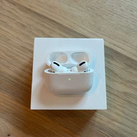 Strøkne Apple AirPods Pro. Alt som fulgte med originalt følger med. Lader og ekstra øreputer er ubrukt.