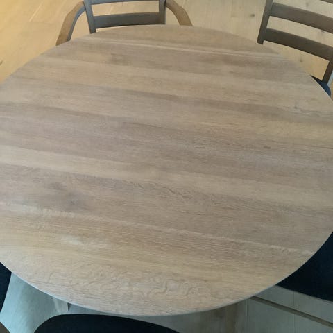 Woodcraft spisebordsplate Ø150 heltre ask. Kjøpt ny på Skeidar for 6mnd siden, men selges da den kom med en liten skade (overflate sprekk) i en ende (se bilde). Selges grunnet reklamasjon og ny bordplate. Sprekken kan lett fikses av noen med litt kunnskap. Bordplaten kan trekkes ut og har plass til to ileggsplater på 50cm. Det kan også kombineres med ulike ben fra samme serie.