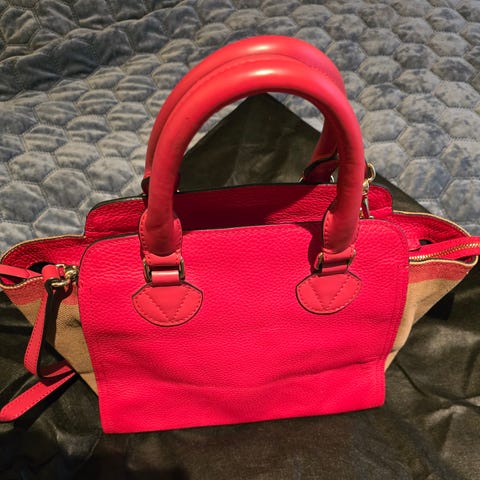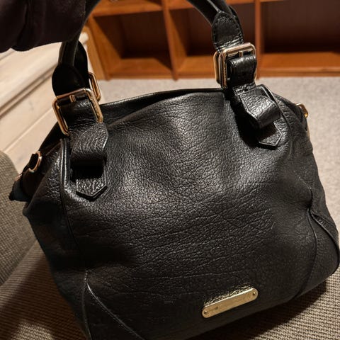 Bally bugget skulderveske laget i lær, designet for dame. Vesken har en svart farge med brune lærdetaljer og gullfarget metallspenne med Bally-logo. Den har en glidelås på toppen for lukking og to skulderstropper. Egnet til daglig bruk og oppbevaring av personlige eiendeler. Den er pen bruk og i god stand, selger for 2500kr.