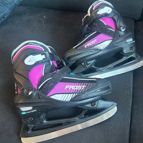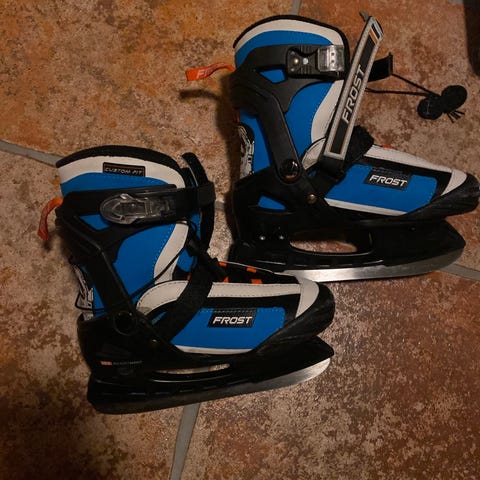 Frost barneskøyter for ishockey i størrelse 33-36( justerbare) Skøytene har svart og lilla farge med hvite detaljer. Egnet for barn og designet som ishockey skøyter.