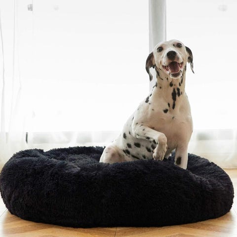 Grå og hvit hundeseng i tekstilmateriale