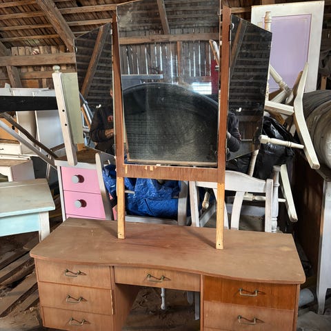 Et sminkebord med flotte detaljer og klassisk teakfinish.