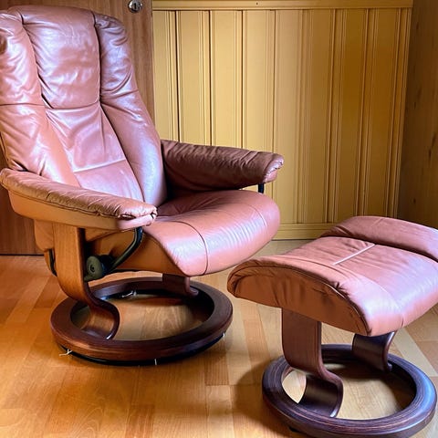 Ekornes Stressless Reno i svart skinn med klassisk fot i kirsebærtre. Med original fotskammel.