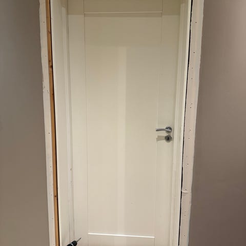 To tunge hvite innerdører + en med glassfelt. Dørene har klassisk design og er egnet for innvendig bruk i bolig eller kontor. Målene er 90x210 og det følger med karm uten dørterskel.