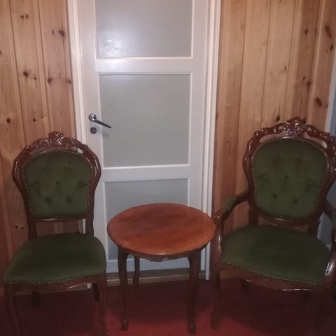 rokokkogrupoe med 2 stoler og bord. 200,- pr stol, 500,- for hele gruppen
