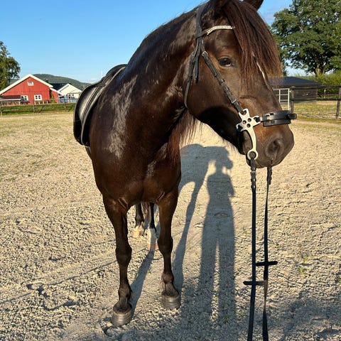 One er utrolig snill, kosete, lærevillig og elsker å bli brukt. Han har hoppet litt under rytter med god teknikk.