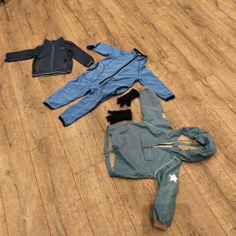 Pakke bestående av dress fra Reflex, jakke fra Hust and Claire og termiske og bukse fra wheat. Dressen er godt brukt og har noen flekker på hetten pluss av skostroppene er slitt. Jakken er pent brukt men refleksene på hetten er litt gule, termodressen er uten bruksmerker. Alt str 92/ 2 år