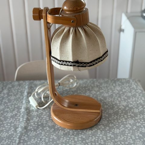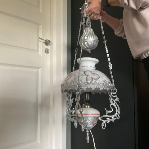 Eldre lampe som dessverre ikke passer inn i vårt nye hjem. Lampa er nedtrekkbar og det er enkelt å bytte lampeskjerm, dersom det er ønskelig.