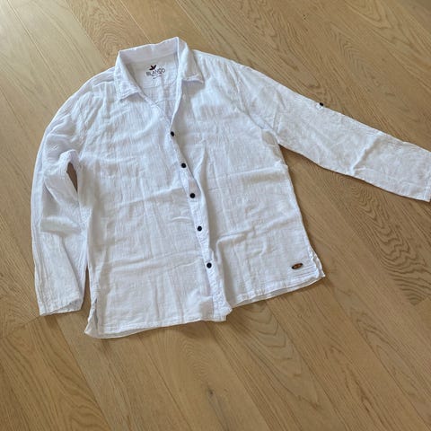 Skjorte i bomull. Unisex. Str. L/ XL. Fargen er hvit. Skjorten har hette og er laget av 100 % bomull. Meget luftig og tynn stoff av bomull. Passer til varme sommer dager eller Syden tur.