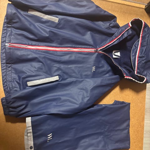 Regntøy fra Color Kids med fleece selges. Selv om det er noen merker enkelte steder er det mye bruk igjen. Stropper til buksen mangler.