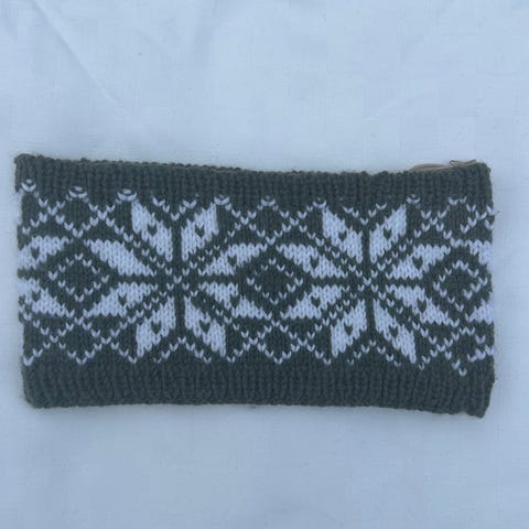 Selger hjemmestrikket pannebånd, strikket i garnet lerke.