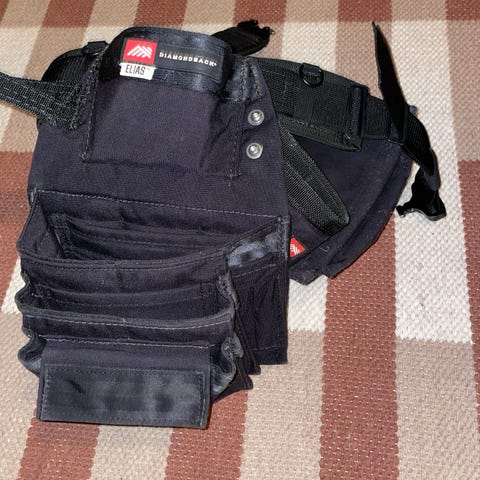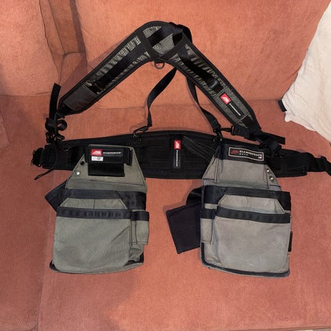 Selger et pent brukt størrelse m-belte, mazo verktøylomme med hammersleeve, Clavo festemiddel lomme og seler. Ikke for stort og bulkete men med god plass til det man trenger.