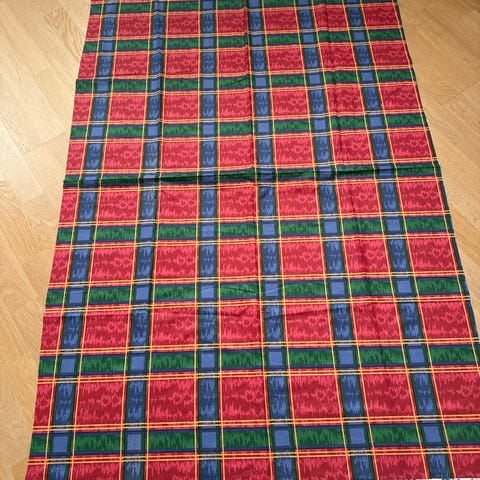 Vintage stoffduk med teksttrykk i svart på beige bakgrunn. Kan brukes som dekorativ duk eller tekstil i hjemmet.