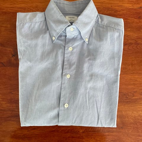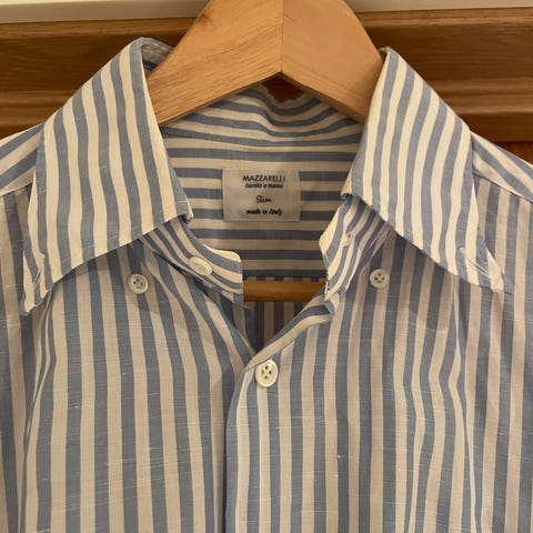 Lite brukt -som ny slim fit håndlaget skjorte fra Mazzareli produsert i Napoli Italy str L/41 blå/hvit stripet selges. kr. 800,-