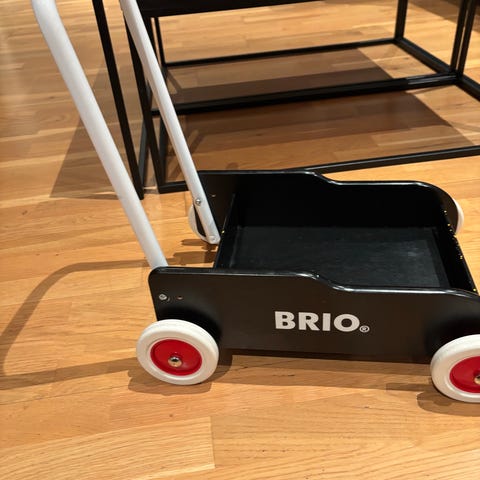 Gåvogn fra Brio selges. Godt brukt, men fungerer fint. Boltene på dekkene kan justeres slik at barnet kan få mer motstand ved gåtrening.
