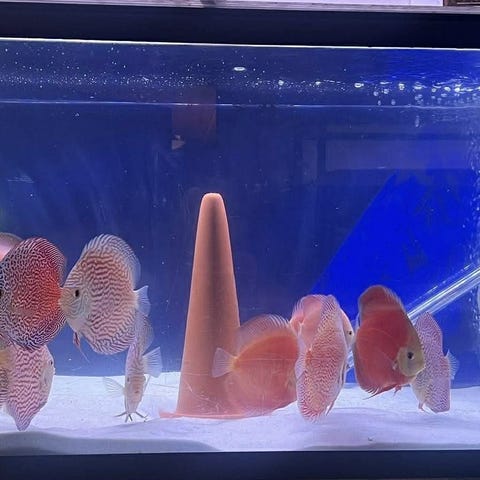 Jeg slutter med discus da jeg har gått tilbake til altumskalarer. Selger derfor mitt discus lekspar, kanskje 2-3 år gamle. Ganske rund og fin form. Vil anta ca 14 cm størrelse. De legger egg, men jeg har ikke lagt forholdene til rette for oppdrett. Fiskene er kjøpt som blå/turkis. De spiser Tetra discus og det meste av frossenfôr. Må hentes på Nesodden.
