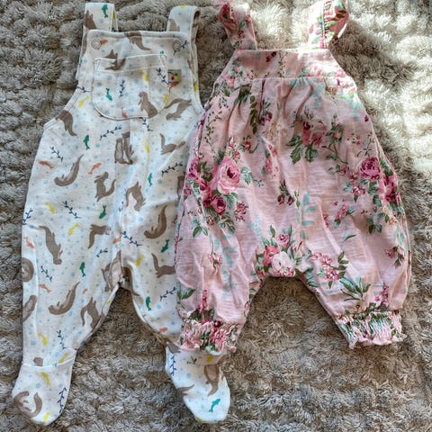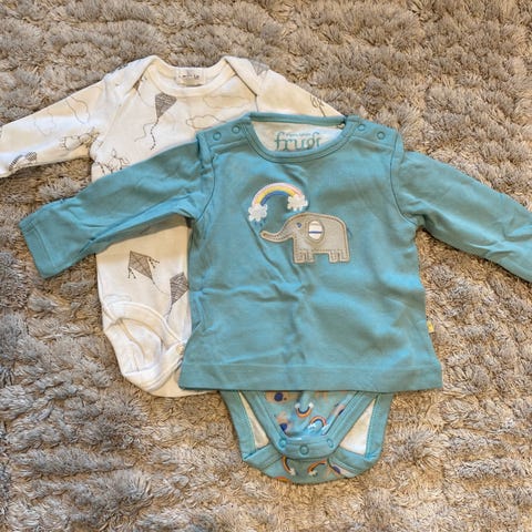 Sett med omslagsbody og bukse til nyfødt. Litt slitasje ved trykknappene i siden på bodyen, men det vises ikke i bruk og påvirker ikke funksjonen.