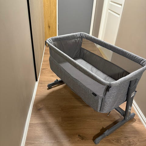 Chicco Bedside crib laget for å plasseres ved siden av foreldreseng, gir enkel tilgang til barnet under søvn. Designet for barn, med myke materialer og sikker konstruksjon.