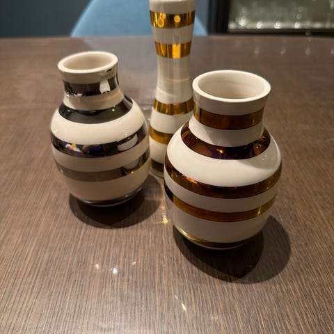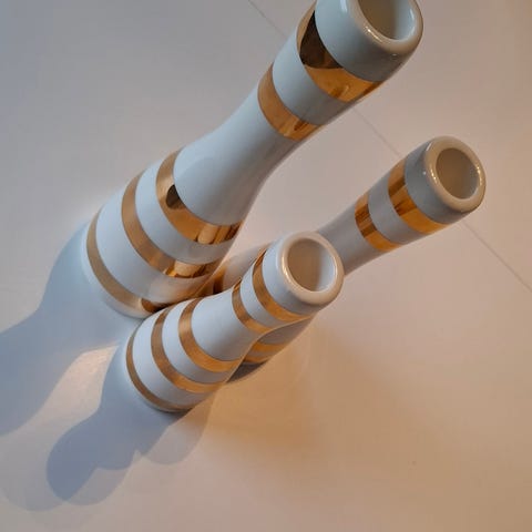 Vase ca 13 cm med sorte striper. Er krakelert. Kr 25. Lysestake med gråaktige striper ca 16 cm kr 50. Porto i tillegg