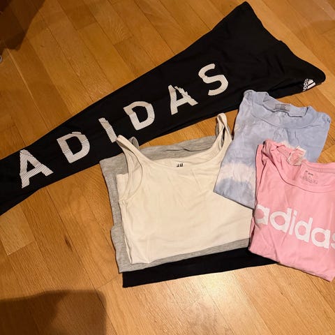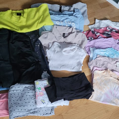 Div klær selges. Mye er ikke brukt er fra størrelsen 146-174 og noe i small. Litt mere enn på bildet er en hel sekk til sammen.