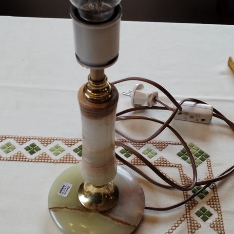 Vintage bordlamper, i onyx, Made in Italia, supplert med metalldetaljeri messing farge og tradisjonell tekstilskjerm med frynser.