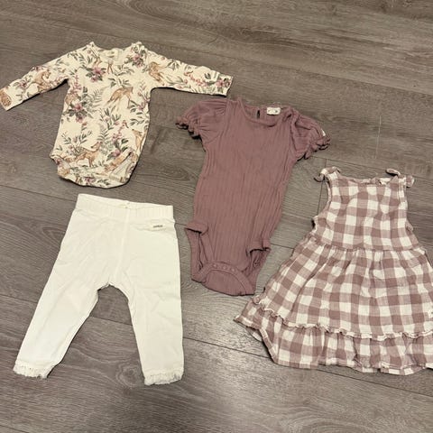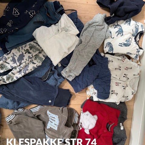 Består av 4 bodyer og 3 bukser. Stortsett fra lindex og newbie. Den stripete er merket 74 og den lyse blå 62, men alt brukt samtidig som 68 av oss :)
