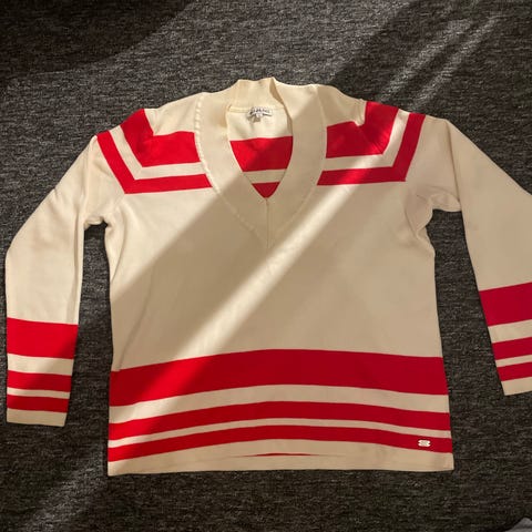 Flerfarget Jean Paul genser selges. Merk bilde 4, litt dratt ut i maskene.