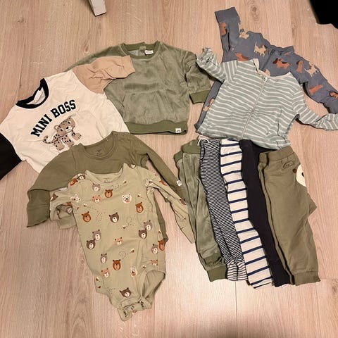 Liten klespakke med 5 bodyer, 2 jumpsuit, 1 genser, 1 bukse, 1 fleece og 1 teddy jakke.