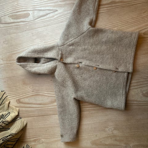 Nøstebarn ullgenser i størrelse 98, farge brun, laget av 100% ull. Genseren er unisex og egnet for barn. Materialet gir varme og komfort, og genseren har knapper foran og hette. Vaskes på 30 grader med skånsom behandling. Mangler de to øverste knappene, ellers i god stand. Kan hentes 90 Haslum i Bærum.