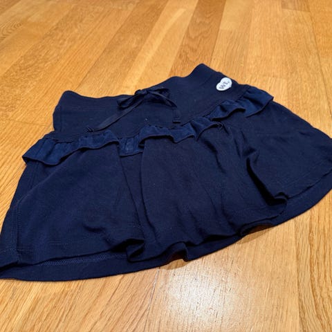 Skjørtet er laget av ullmateriale og har justerbare skulderstropper med rysjedetaljer.