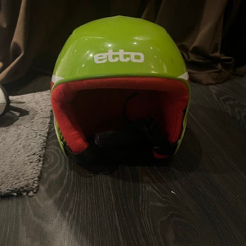 Pent brukt slalomhjelm, med noen synlige merker.