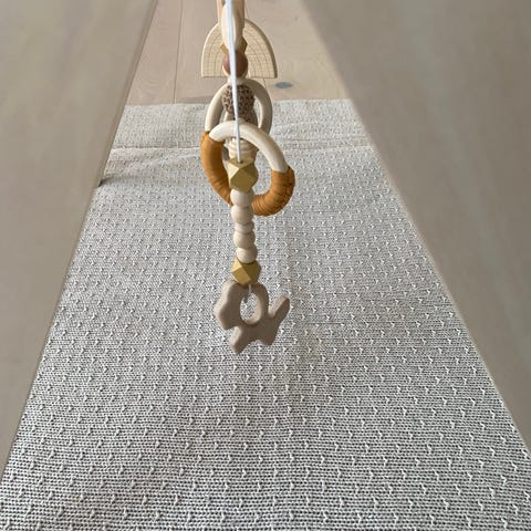 Godt brukt, men mye bruk igjen. Kan demontere med knapper/klemmer og vaske matta på 40 grader. Babyer liker sterke farger og svart-hvitt motiv, så er bra for stimulering.