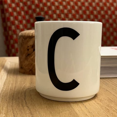 Design Letters kopp med bokstaven C. Kopp i hvit farge med svart trykk. Laget i keramisk materiale.