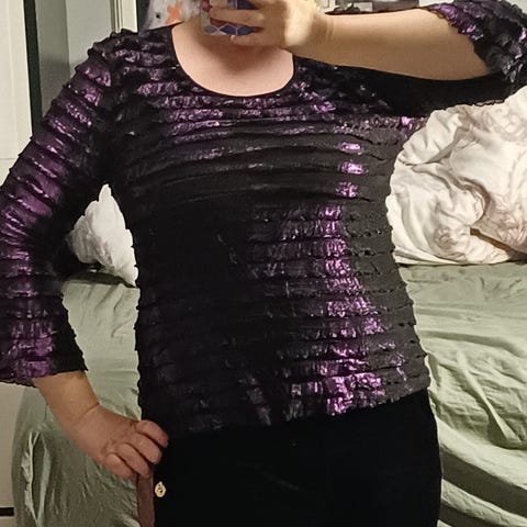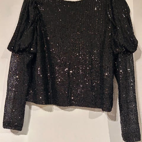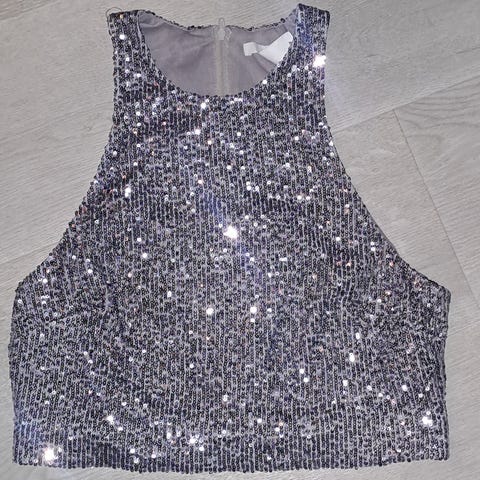 Grå med paljetter i sølv. Armer med hull som viser skuldre. Merke Dratella.