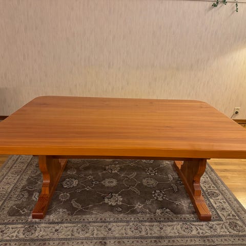 Spisestue selges. Størrelsen på bordet: 1 m bredde og 2 m langt + ileggsplate på 50 cm, mørkbeisa finert eikebord. I god stand, men noen bruksmerker.