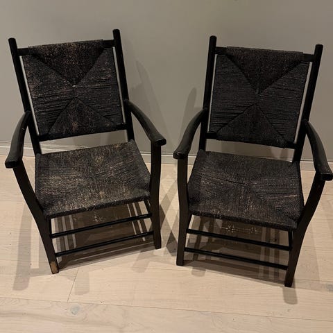 Stolene er ellers hele å fine, problemet er det imiterte skinnet har gått i oppløsning derfor vi kjøpte trekk til disse som følger med.