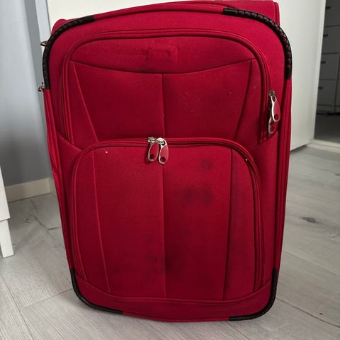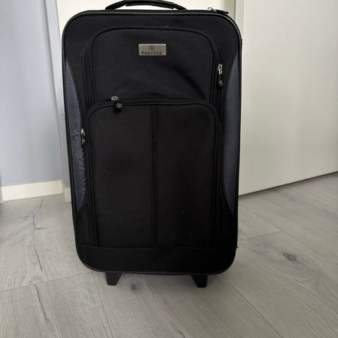 Koffert som kan brukes men er noe som ikke helt fungere med ene hjulet.Kan rulles men ikke helt jevnt.