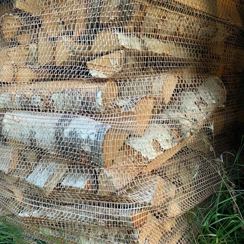 Tørr 1500 liter bjørkeved i notsekk.