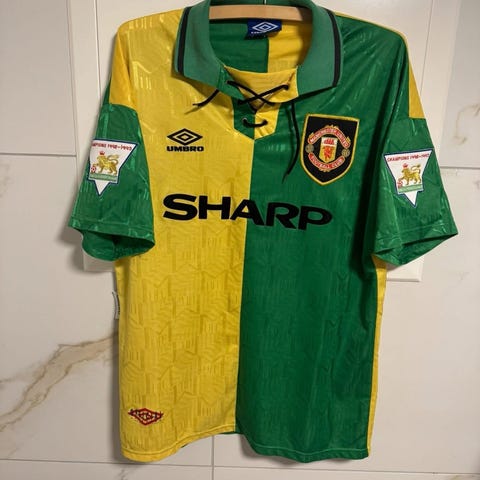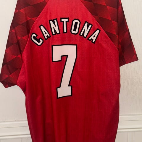 Selger en retro Manchester United-drakt fra 1996, med Eric Cantona på ryggen.